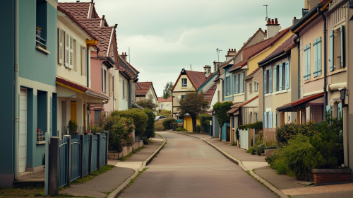 Analog color Photo: A quiet residential street in a colourful, dynamic, futuristic sci-fi city in France, houses with a blend of traditional and modern architecture. Thousands of houses as far as the eye can see --ar 16:9 --stylize 50 --v 6.0 --no cars