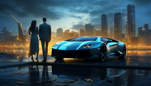 a couple pose next to a lamborghini with city in background, in the style of daz3d, moosa al halyan, igor zenin, money themed, 32k uhd, white and cyan, leo putz --ar 128:73