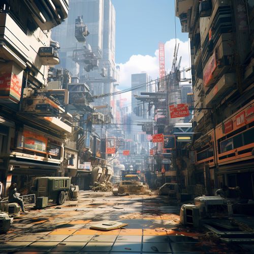 cyberpunk city scenario environment only dry weather, sunny daylight, low angle camera