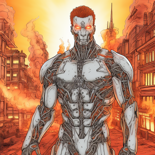 a detailed adult coloring page featuring a cyborg standing in a city that is ruble and in flames ar--17:22