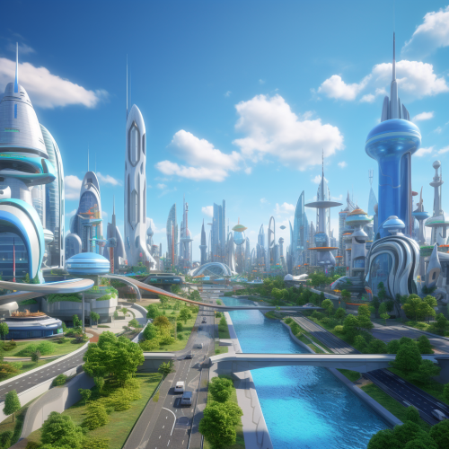 make 3d rendered disney pixar style futuristic Jakarta city with blue sky in the background with skyline buildings and landmark tower. make it HD in 4K format 3840 x 2160 pixels.