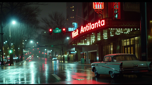Eye-level shot of boulevard in downtown Atlanta on a A gloomy, rainy, grey day, dark clouds, with a bright neon 1950s cinema sign reading "Visit Antilanta" --v 6.0 --ar 16:9