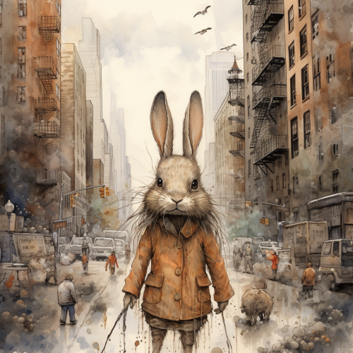 drawing of female bunny rabbit, style of rust, standing in the middle of new york city, small rabbits in the distance