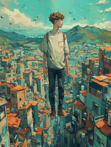 The painting depicts a young man, around 22 years old, dressed in a simple yet futuristic outfit. He stands suspended in mid-air, soaring above the buildings. Surrounding him are futuristic cityscapes with mountains and forests in the distance, styled akin to Korean comic art , --ar 3:4 --v 6.0