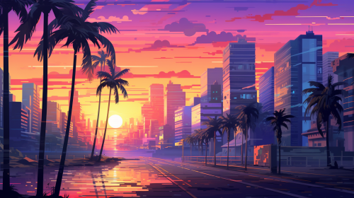 gaming characters, morning in a tropical city with buildings, fun energetic vibe, 8 bit theme, painting artstyle, --ar 16:9