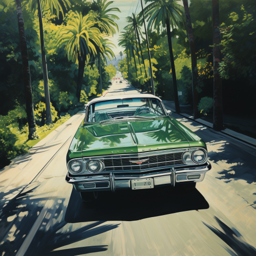 Aeriel view of green Impala driving down a Los Angeles palm tree lined street --s 250