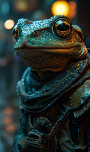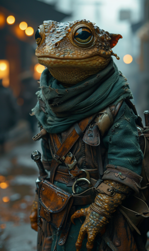 humanoid sized bullywug fighter in a city editorial photoshoot --ar 3:5 --s 750 --v 6.0