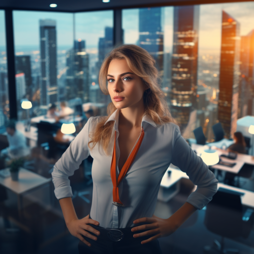 Industrial Lead Generation Agency Social Media Office Workplace in high office with city in the background Beautiful Woman looking at you
