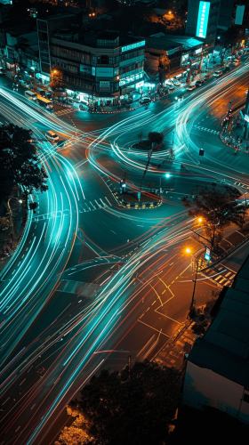 A nighttime shot of a busy Jakarta intersection, captured with slow shutter speed from a high vantage point, lights of vehicles creating dynamic motion trails, subtle greenish tint on shadows, muted colors, film grain --v 6.0 --ar 9:16 --style raw