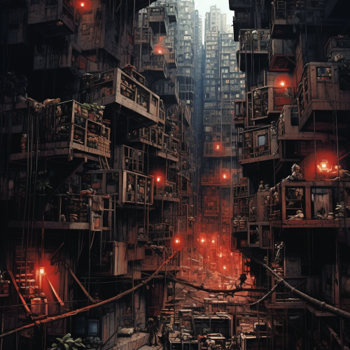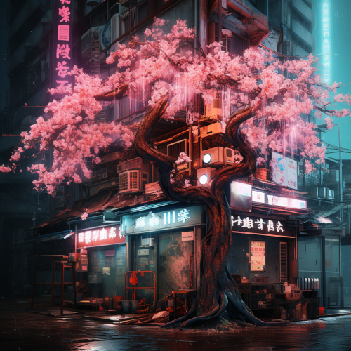 kowloon walled city, cyberpunk, single cherry blossom tree surrounded by decay, neon lights, gritty, wet