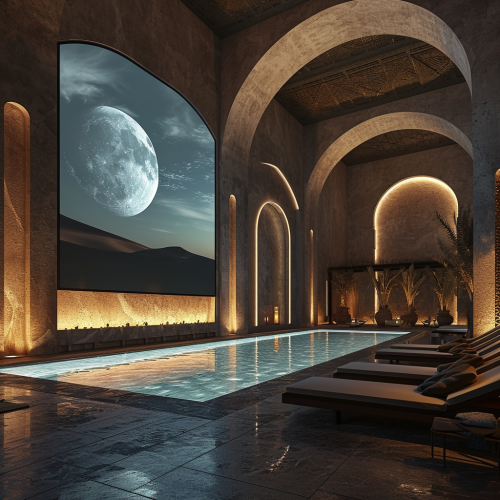 aerial view 3d schematic of luxury spa, ultra minimal, rentagular pool, arches one wall is entirely a video wall of morrocan desert sky at night with massive moon on the screen --v 6.0