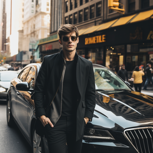 Photorealistic shot of half body - portrait style, on a city street at the location of a photo shoot. Highly detailed, high definition, high contrast, high quality. Beautiful woman, looks like a model, expressive look, dynamic, wide-angle view, close-up, in the city of the future, shiny/shining, cute office black /charcoal reds/purple, pink/gold. Cute, round, mouth agape, hour glass shape, gorgeous eyes, anime style blush, Screen Space Reflections, Diffraction Grading, Chromatic Aberration, GB Displacemnet, Scan Lines, Ambient Occulsion, Anti-aliasing, FKAA, TXAA, RTX, SSAO, OpenGL-Shader's, Post Production, Cell Shading, Tone Mapping, CGI, VFX, SFX, 35mm lens, f/3, accent lighting, global illumination, sports illustrated theme --ar 4:7 --style expressive --stylize 1000 --niji 5 --c 100