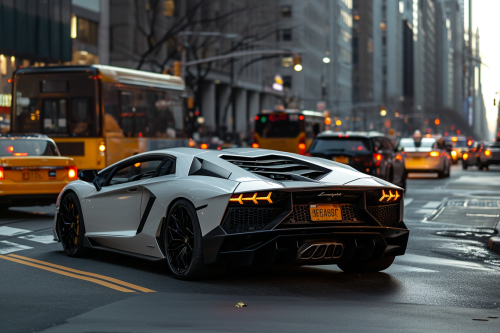 Wide photograph taken on old black and white film of 1930s Manhattan New York busy street with many cars and people::1 a modern 2022 lamborghini aventador in the traffic::5 --ar 3:2 --v 6.0