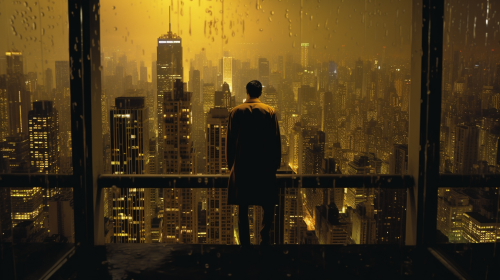 Still from the 1999 film The Matrix, the scene with Tony Leung dressed in yellow Balenciaga gazing out a high rise window looking out into the cityscape