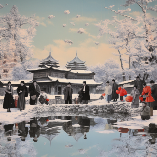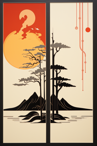 Create a Cubist reimagining of an Asian woman's portrait, fragmenting her face into bold geometric planes showing multiple perspectives simultaneously. Maintain the original's warm amber and orange palette but break it into sharp, angular sections. Transform the neck tattoo into an abstract pattern of interlocking shapes that defies natural perspective, while the traditional hair bun and flower should become a dynamic explosion of spiky forms. Fragment the background's arches into overlapping geometric shapes, with asymmetrical features and bold line work characteristic of Picasso's style. Ensure the final piece captures both the power of the original portrait and the revolutionary spatial distortion of Cubism.