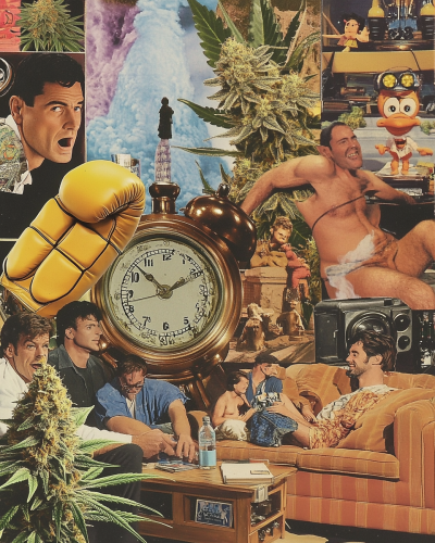 Dynamic retro travel collage featuring old-school travel scenes like vintage trains and buses, with a color scheme of bright oranges, blues, and greens.