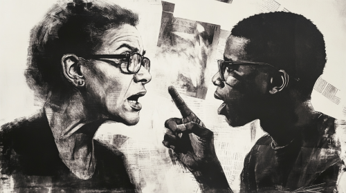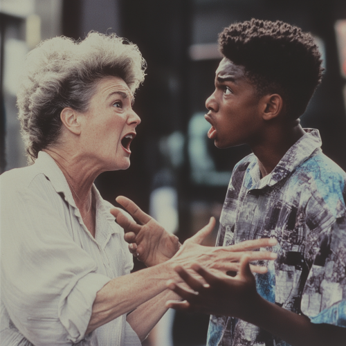 a newspaper collage style image from 90s, a white ugly woman in her 43 years old argues with a afro-american, mixed race, teenager boy who is 18 years old. real emotions, real image, 300dpi, high-res, movie still like shot, cinematic , cineamtic frame, movie, newspaper 1992