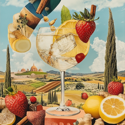 collage of gin cocktail with ingredients like juniper berry, ginger, lemon, strawberry, cinnamon and multiple shapes with enclosed landscapes in them . gin cocktail is in the foreground and prominent. which is just gin and tonic