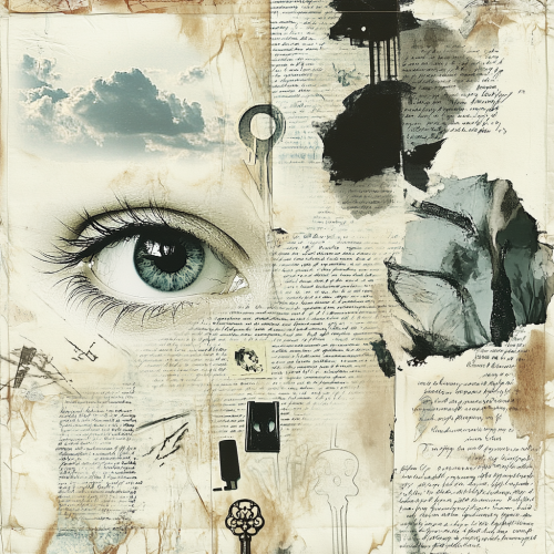 A visual diary page inspired by a dream journal quick, expressive sketches of eyes, keys, clouds, and hands. Incorporate collage techniques with layered textures and a slightly worn, paper-like background, in muted, vintage tones.