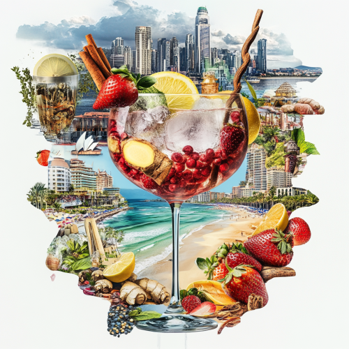 collage of gin cocktail with ingredients like Juniper berries, ginger, cinnamon, lemon, strawberry around it and multiple shapes with enclosed natural landscape like beach and city in them