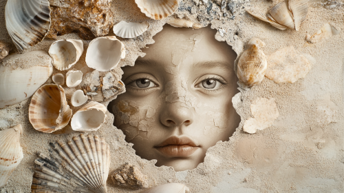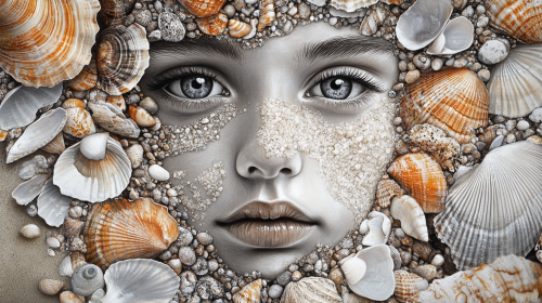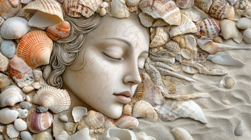 collage of natural materials collected in the shells shells pebbles sand feathers Venus goddess, face of 12 years old beauty venus girl is pencil drawing --ar 16:9 --v 6.1