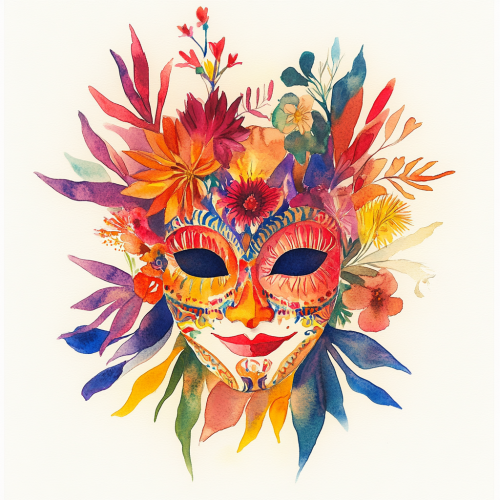 In this design, the four elements are presented as a collage of distinct rectangular panels. Each panel features a minimalist representation of an element using clean lines and subtle colors. Earth includes mountains and trees; Air is represented by feathers and birds; Fire showcases flames and geometric patterns; Water features flowing waves. These panels are arranged dynamically, and at the center, a stylized La Catrina figure is surrounded by papel picado patterns, visually connecting her to the elements --ar 2:3