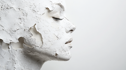 an image of the side of a human's face. white background. zoomed out, Photomontage, collage, textured, fantasy feel, paper cut-out, muted, not messy, clean. --ar 16:9