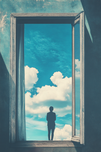 surreal collage of a vintage window with a person in the midst of a blue sky with clouds, open window with curtains. Vintage retro style, minimalist design. --ar 2:3