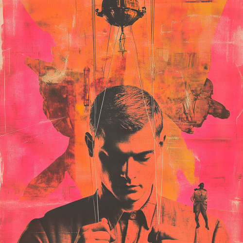 Dark fantasy collage of puppet master controlling puppets in the style of russian avant garde poster art, orange and pink hues, a white man with short hair holds two strings connected to his head, behind him is an object on a string that he controls.
