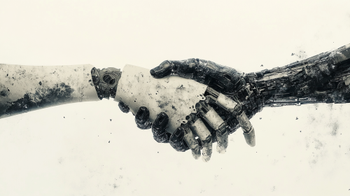 a robot hand shaking a human hand. Photomontage, collage, textured, fantasy feel, paper cut-out, muted, not messy, clean. white background. --ar 16:9 --v 6.1