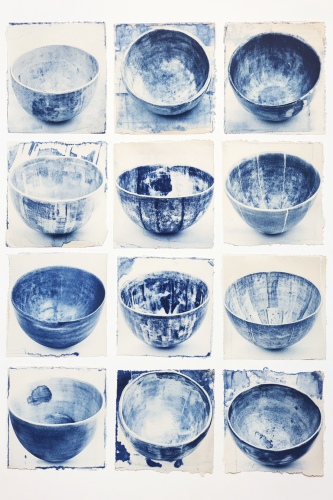 A grid of blue and white cyanotype bowls, each bowl with a different blue cyanotype-print. The texture has an aged look, with visible wear on the edges and signs of use in their patterns. The bowls have been cut out from paper and pasted onto a watercolor grid background. Abstract bowls on white and blue watercolor background in a grid. Collage with aged paper, watercolor, and cyanotype papers used to depict bowls in a grid. the bowls are 2-dimensional, primitive-type shapes. --ar 2:3