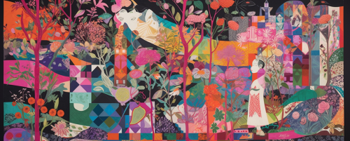 A colorful patchwork collage of images, including a white building surrounded by trees and flowers, pink lines and shapes with blue edges, an abstract figure in dark purple holding their hands above their head, another figure wearing red pants standing on the left side of the frame, pink and fuchsia patterns, and green leaves and branches, with black outlines and red highlights, in the style of David Hockney. --ar 82:33 --v 5.0 --s 750