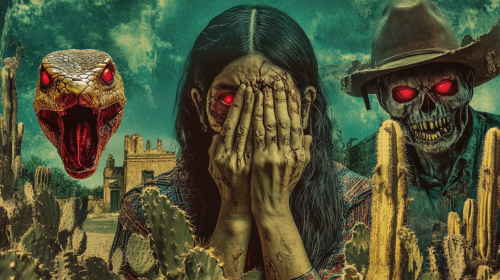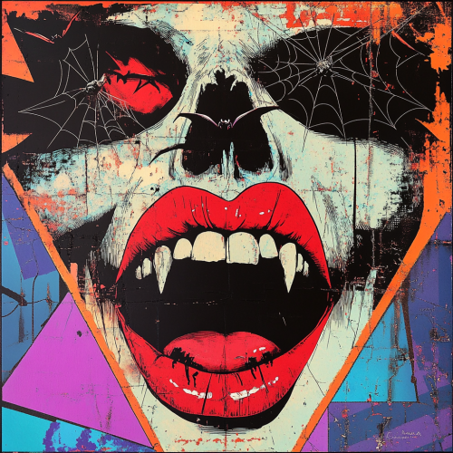 Candy wrapper collage of a zombie digging a grave in a spooky graveyard surrounded by dancing vampires, by Hokusai. --s 50 --v 5.2 --style raw