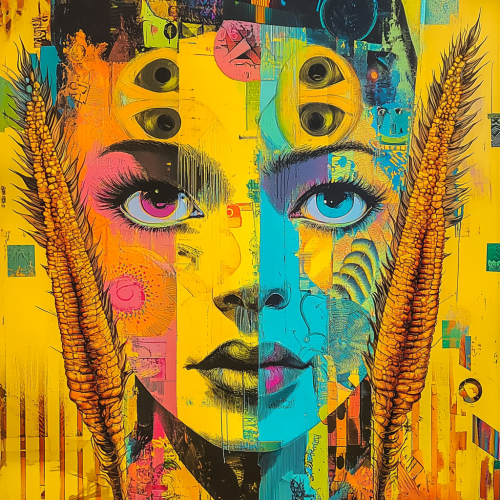 Graffiti style, collage, beautiful bright colours, yellow and light blue, 3 ears of corn, Azteca, Egyptian symbols, tropical punk, detailed, baroque, 16K, abstract, symbolism style, surrealistic beauty, Vivid colours. Geometric. Portraits. Illustrative. Picasso style, 16k detailed, with elements of Gustav Klimt