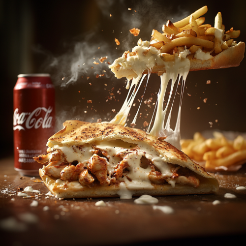 A very realistic side image of a French Tacos Galette armeniane like thin toasted Armenian, is cut in half,consisting of with chicken pieces, french fries, and white cheese sauce melted in an advertising manner,so that part of the chicken pieces, french fries and white sauce are flying in the air in an advertising design. Artistic, so that smoke rises from it, and the white sauce fromage melting appears in an advertising manner. Next to them is a box of french fries with ketchup sauce in an advertising manner, and next to them is a can of Coca-Cola that appears in an advertising manner.