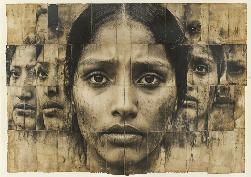 A photograph of two squares made up of black and white photos, each square containing the face of a Latin American woman crying and ashamed. The overall composition is asymmetrical, with one side having more women than the other. Both sides have large numbers of circles in various sizes and shapes. The background color is shades of brown. This work appears to capture images from different angles, creating a collage effect that adds depth and texture to the artwork. --s 750 --v 6.1 --ar 64:45 --q 2