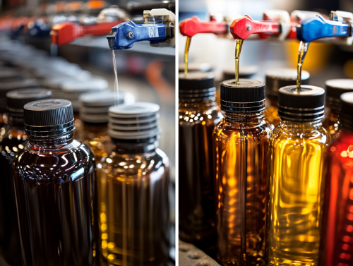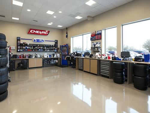 A visually appealing collage of automotive services, including tire changes, oil changes, battery replacement, and fluid top-ups, set in a clean, professional garage environment. Subtle Chevron branding colors (blue, red, and white) are integrated into the technician uniforms, tools, and equipment accents, adding cohesion to the image. --ar 4:3 --c 33 --s 333