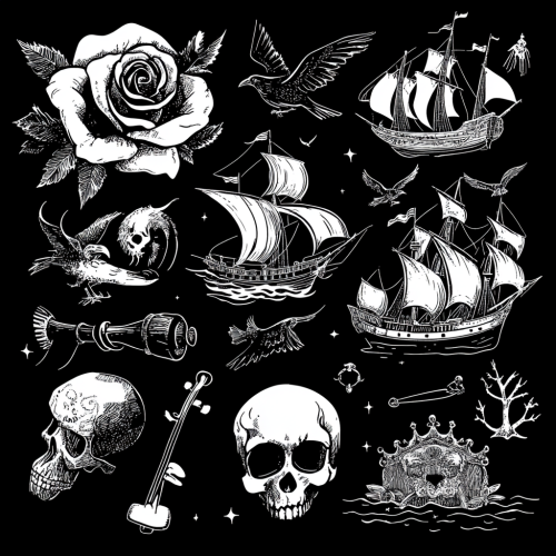 a graphic hand drawn design of a rose, an ocean wave, a ship, ravens, shakespeare, a skull, a guitar, a crown, all collaged together. Simple line drawing style. One color. Minimal.