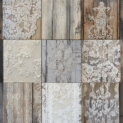 A collage of vintage lace panels on aged wood, creating an old-world charm for wedding ceremony decor. The lace is in various shades and patterns, with some tattered edges to add character. This composition creates a rustic yet elegant atmosphere suitable as a backdrop for the photographer's shots.