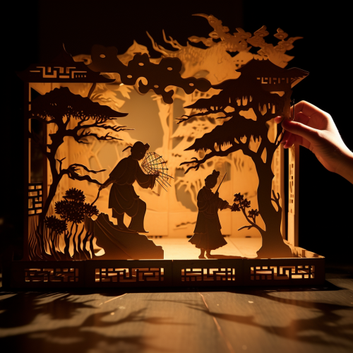 shadow box 14 inches high by 14 inches wide and 4 inches deep with illustrations of a whimsical scene using five illustration with cut out in order to make one diorama.