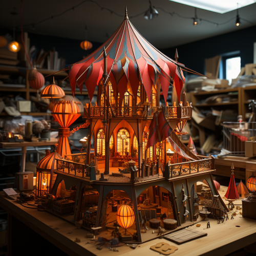 circus tent, made from cardboardboxes, night, cardboard box sideshows --s 750