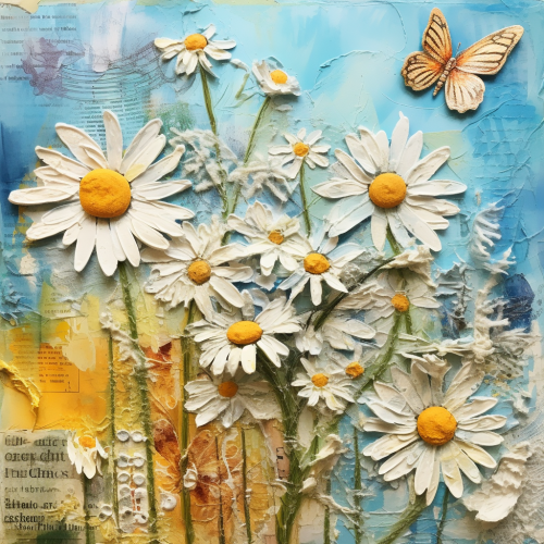 a junk journal page featuring a collage of daisies, butterflie,s and other objects, in the style of textural layering,Scottishh landscapes, ethereal foliage, mixed media mosaics, delicate flora depictions, mutedcolorss, impressionist gardens --ar 1:1 --c 10