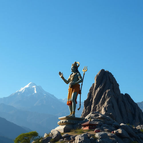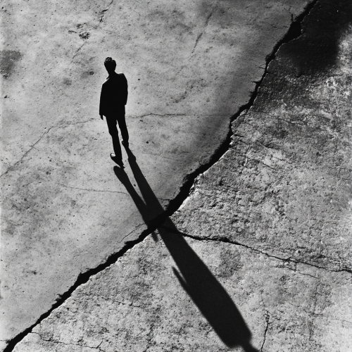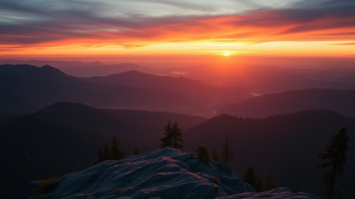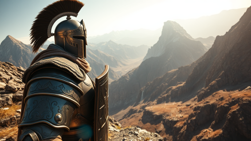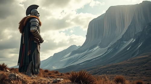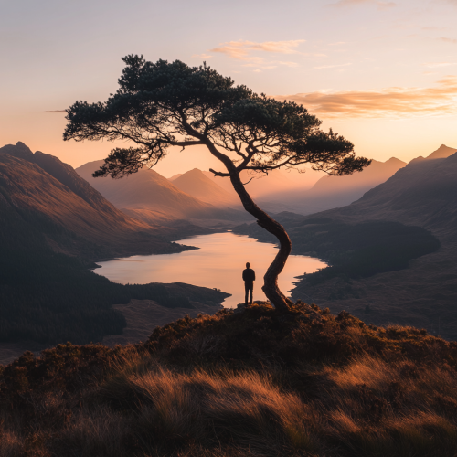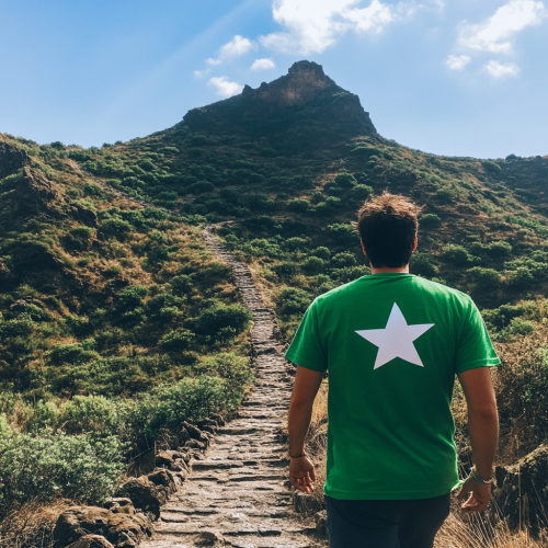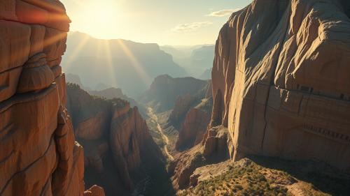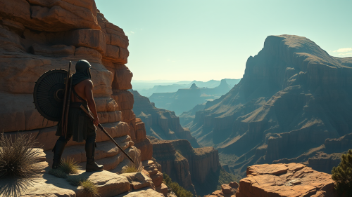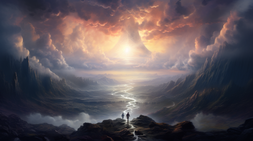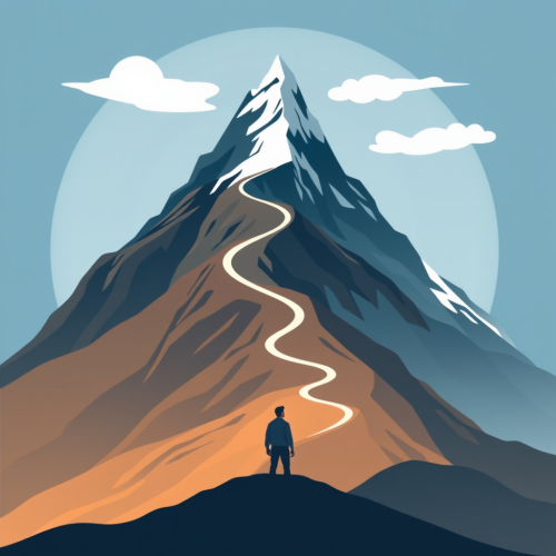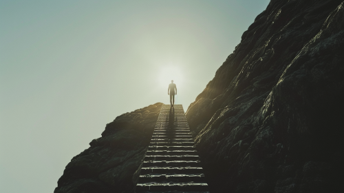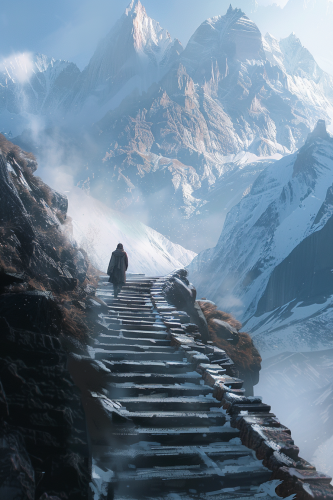From a low angle behind the man, he walks up a straight, endless staircase set into the mountain, with the steps disappearing into the distant sky. The rugged terrain around him adds to the sense of challenge. The sun is low, creating a silhouette effect and harsh lighting on the steps, hd quality, realistic textures and shadows --ar 16:9 --v 6.0