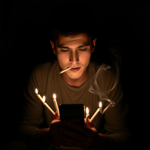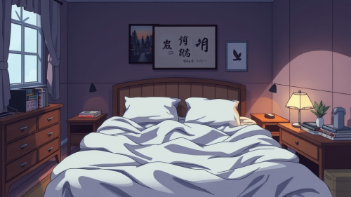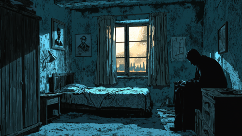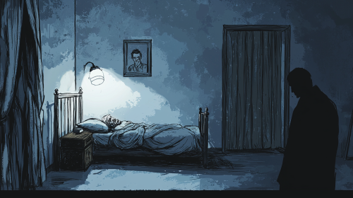 A comic art style scene set in 1940s Turkey, depicting elderly Raif from 'Madonna in a Fur Coat' by Sabahattin Ali. 16:9 aspect ratio, showing a wide view of a dimly lit, modest bedroom. Raif sleep in a narrow bed positioned against the far wall, appearing small and vulnerable in the distance. In the foreground, dominating the right side of the frame, sits the silhouette of a man watching over Raif. This figure is intentionally ambiguous - it could be Raif's younger self, or perhaps a metaphorical representation of his memories or regrets. The silhouette is solid black, its edges slightly soft, adding to the dreamlike quality of the scene. Raif, now in his sixties, is barely discernible in the distance but his frail form can be made out under a thin quilt. His grey hair is a pale spot against the pillow. The small details of his face are not visible from this distance, leaving his expression to the viewer's imagination. The room is illuminated by a combination of faint moonlight streaming through a partially curtained window and the warm, soft glow of a distant street lamp. This creates a play of cool blues and silvers contrasted with muted golden tones, casting long, atmospheric shadows across the room. The color palette is predominantly cool and muted - deep blues, greys, and pale silvers, with touches of warm golden light adding a nostalgic feel. The contrasts are soft, adding to the dreamy atmosphere. Sparse furnishings are visible: a small nightstand by the bed, a writing desk in one corner, and a wardrobe against another wall. On the wall above Raif's bed, a faded painting of a European cityscape is barely discernible, a distant echo of his past. The blend of 1940s comic art style and photorealistic details is maintained, with subtle Ben-Day dots texture for [...]