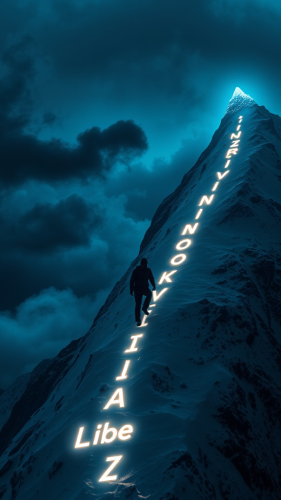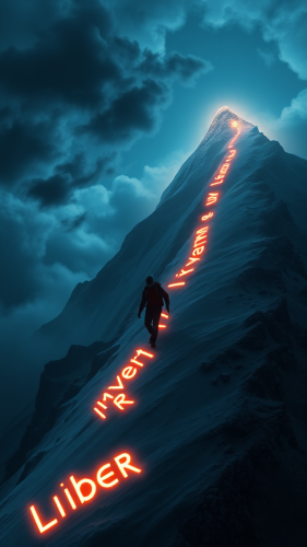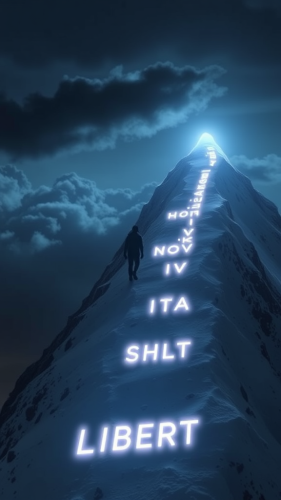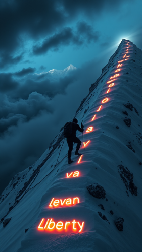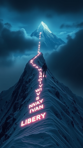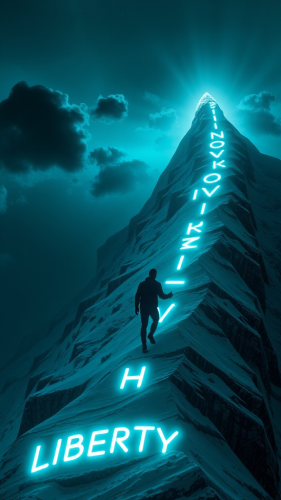 Depict a faceless figure climbing a steep whate neon-lit mountain, with the words Novikov Ivan and Liberty glowing along the trail. Dark clouds and obstacles hover in the background, symbolizing difficulties, while a faint glowing peak shines above, showing the end goal. The figure is determined, with soft light highlighting their effort.