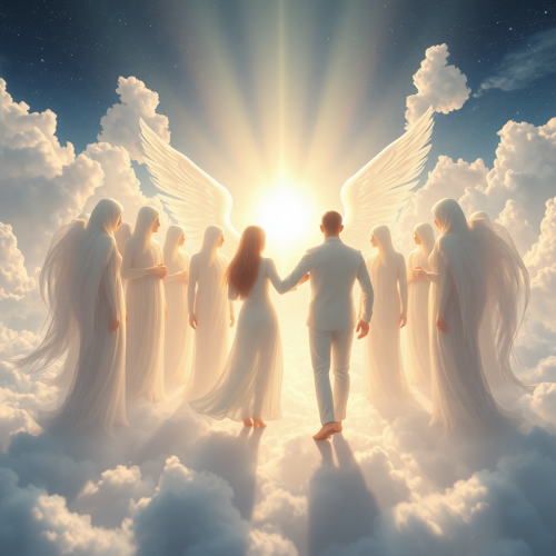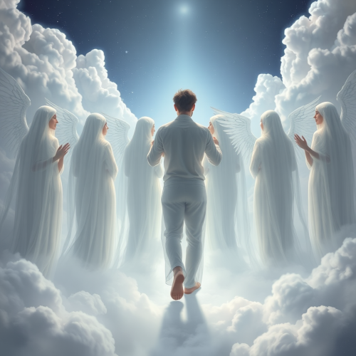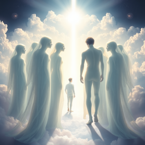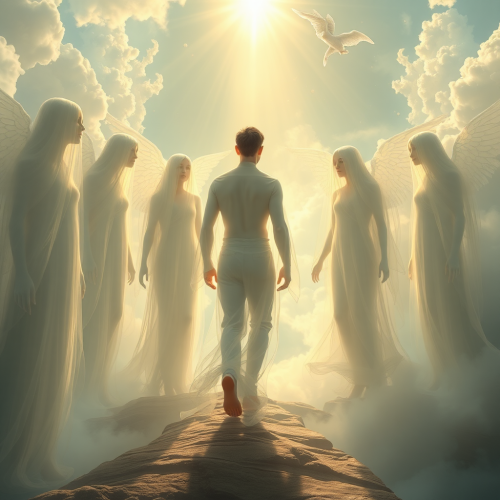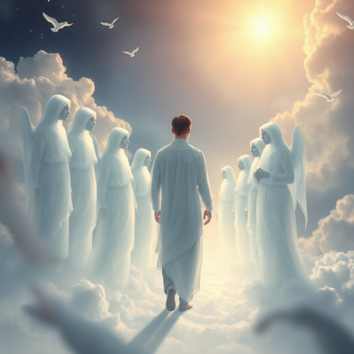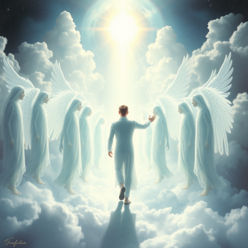 A rough, chaotic pencil sketch depicting a figure running joyfully towards a radiant light, where angels are dancing in celebration. The figure is filled with energy and happiness, with their body leaning forward as they rush towards the glowing scene. The angels are abstract and ethereal, drawn with light, swirling lines, adding a sense of movement and joy. The background is bright and minimal, with the light emanating from the dancing angels, creating a path for the figure to follow. The overall atmosphere is uplifting and filled with a sense of joyous anticipation, capturing the figure's excitement as they run towards the heavenly scene. --c 8 --ar 16:9 --v 6.1
