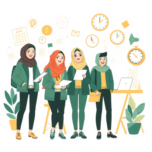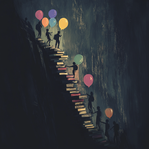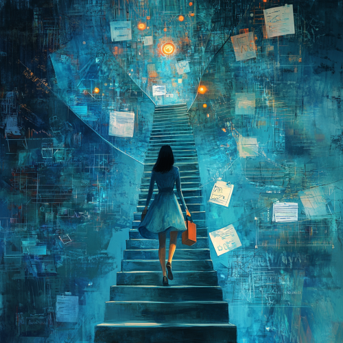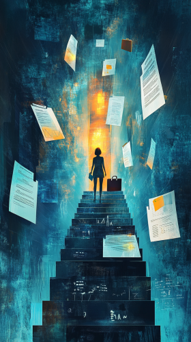 The Journey Upward Concept: Maya is depicted climbing a steep corporate ladder or staircase, with symbols of career success like documents, graphs, and briefcases attached to the steps. Above, glowing lights or open doors await.--ar 9:16 --v 6.1
