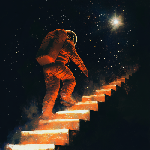 an astronaut in an orange suit, climing up steps in space in the dark, steps light up as they take steps forward, reaching for a bright star just a a few steps away.