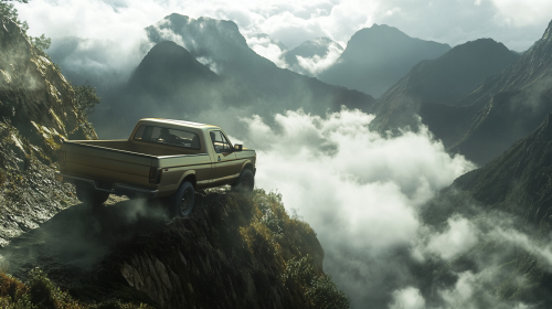 Create an ultra-realistic shot of a beige Ford pickup truck as it climbs above a dense layer of clouds on a steep, narrow mountain road. The truck, carrying the protagonist and Rolo, breaks through the clouds, and sunlight streams in, casting a warm glow over the rugged vehicle and the rocky path ahead. Below, a sea of thick clouds blankets the landscape, creating a stark contrast between the bright, open sky above and the misty depths below. The sunlight is vivid, illuminating the peaks of the surrounding mountains and highlighting the textures of the rocky cliffs and sparse vegetation. Shadows cast by the steep ridges add depth and grandeur to the scene, while the crisp, clear sky above creates a sense of openness and freedom as the truck advances on the elevated road. This moment captures the feeling of overcoming adversity, with the characters reaching a high point above the clouds, surrounded by a breathtaking, sunlit landscape that signifies a new phase of their journey. --ar 16:9