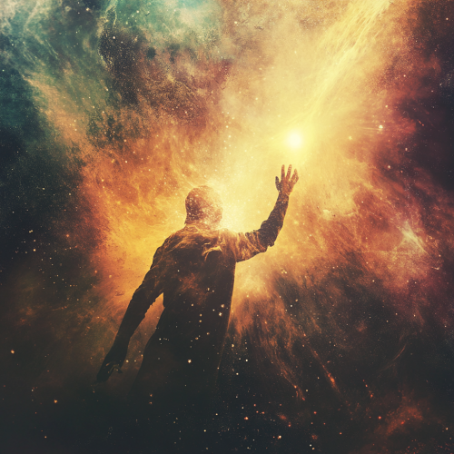 An album cover showcasing a figure reaching out towards a burst of light or a radiant source. Use bright, warm colors and ethereal effects to capture the idea of reaching out and seeking inspiration or guidance.